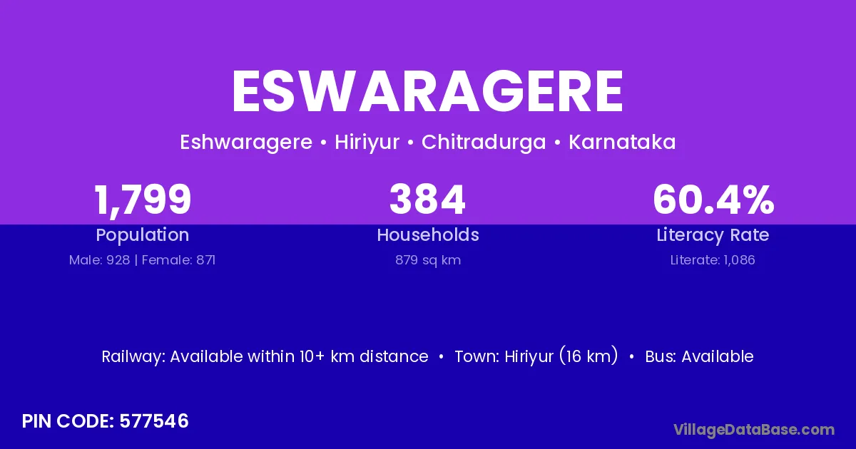 Eswaragere village has a total population of 1,799 people, of which 928 are males and 871 are females.