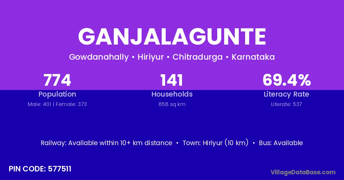 Hiriyur (10 km) is the nearest town to Ganjalagunte village for major economic activities and is located approximately 10 km away.