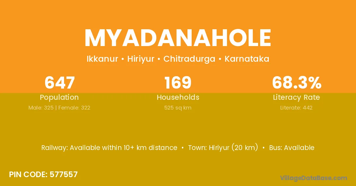 Hiriyur (20 km) is the nearest town to Myadanahole village for major economic activities and is located approximately 20 km away.