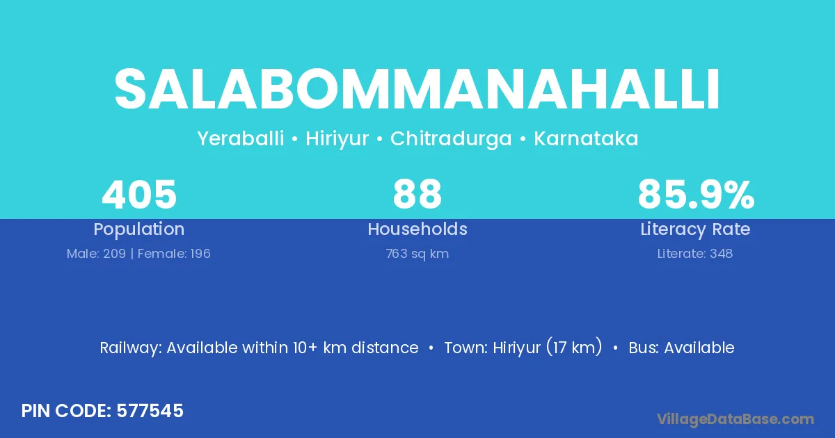 Salabommanahalli village has a total population of 405 people, of which 209 are males and 196 are females.