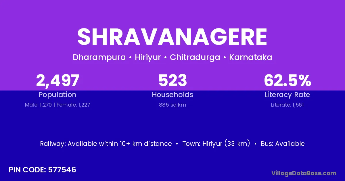 Shravanagere village has a total population of 2,497 people, of which 1,270 are males and 1,227 are females.