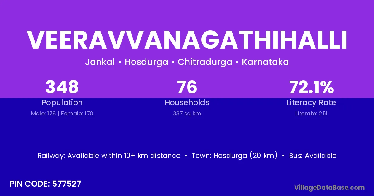 Hiriyur (26 km) is the nearest town to Veeravvanagathihalli village for major economic activities and is located approximately 26 km away.