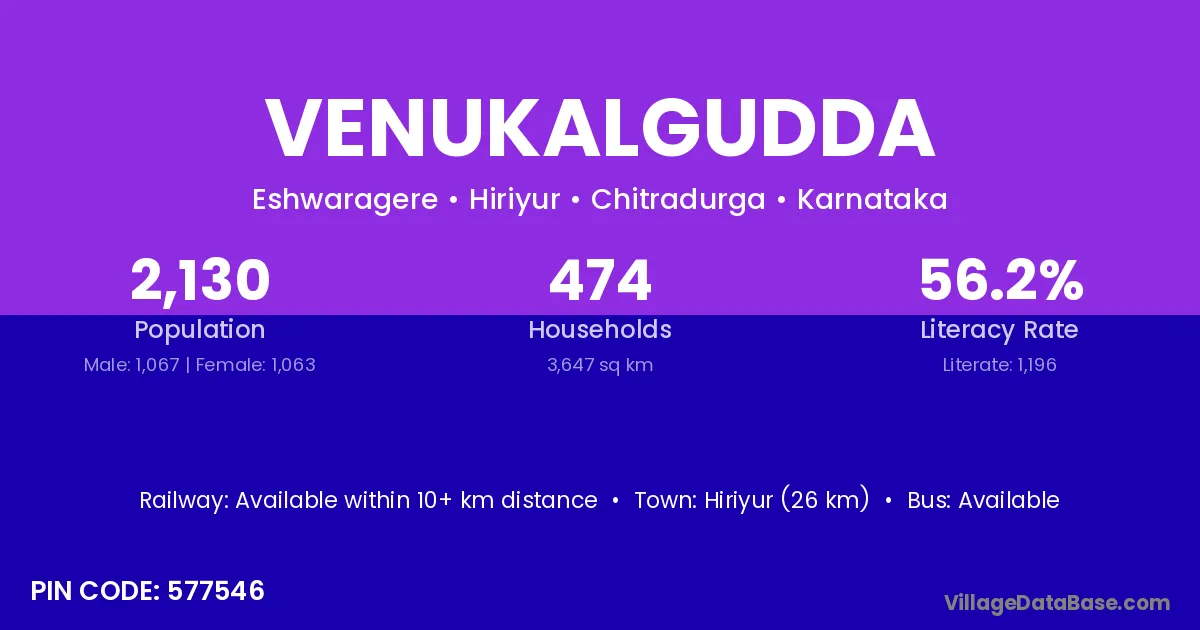 Venukalgudda village has a total population of 2,130 people, of which 1,067 are males and 1,063 are females.