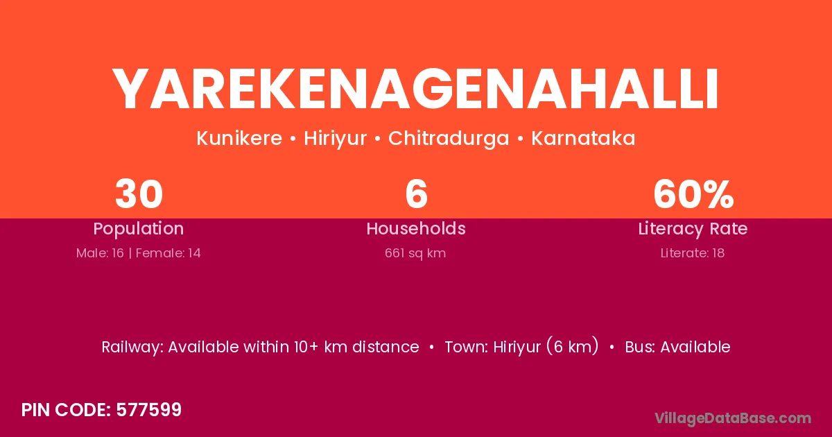 The literacy rate of Yarekenagenahalli village is 60.00%. Male literacy stands at 75.00% and female literacy at 42.86%.