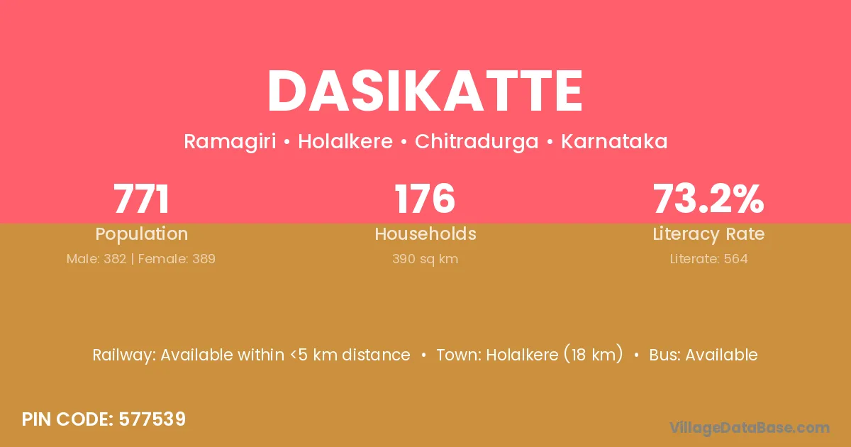 Dasikatte village has a total population of 771 people, of which 382 are males and 389 are females.