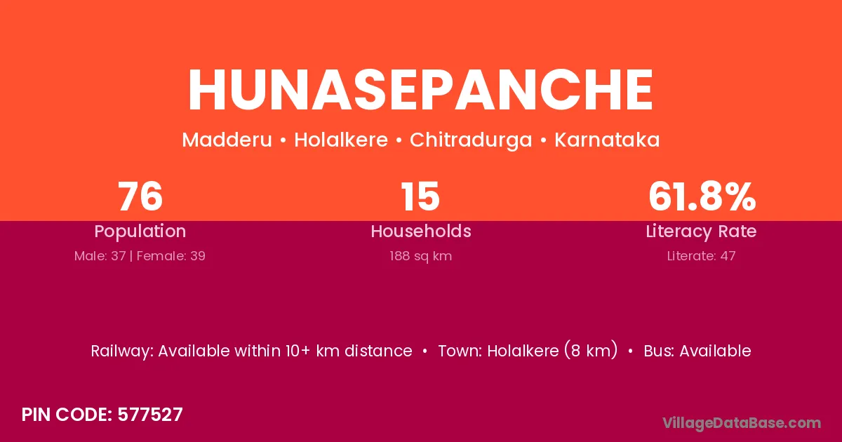 Holalkere (8 km) is the nearest town to Hunasepanche village for major economic activities and is located approximately 8 km away.