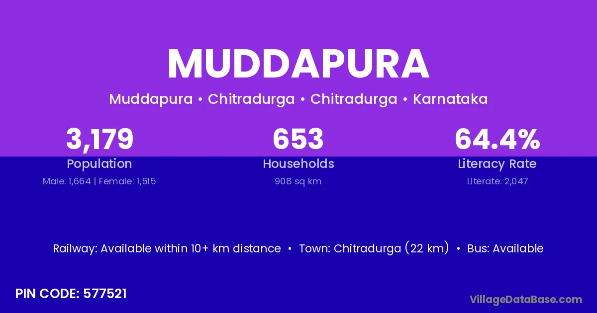 Holalkere (30 km) is the nearest town to Muddapura village for major economic activities and is located approximately 30 km away.