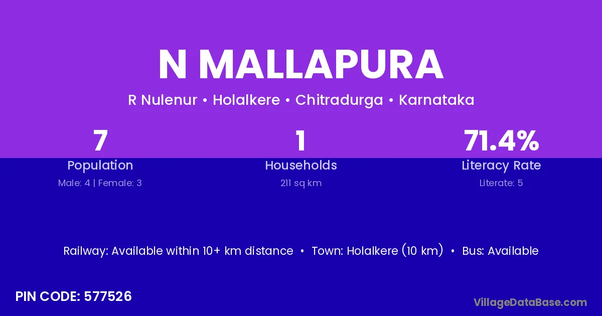 Holalkere (10 km) is the nearest town to N Mallapura village for major economic activities and is located approximately 10 km away.