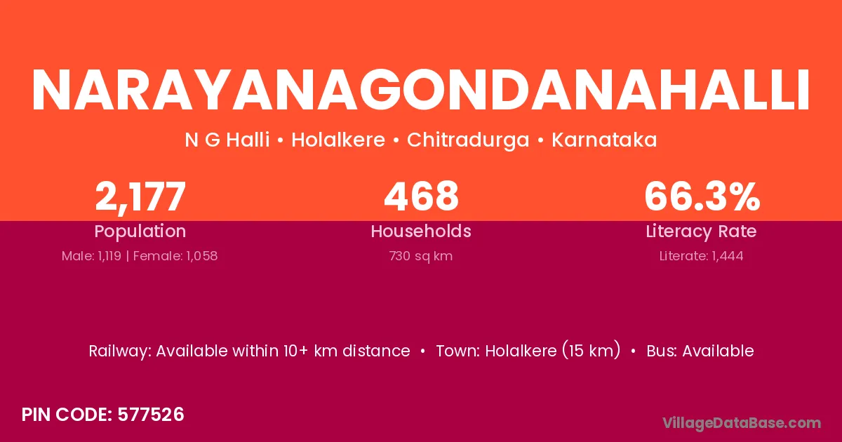 Narayanagondanahalli village has a total population of 2,177 people, of which 1,119 are males and 1,058 are females.