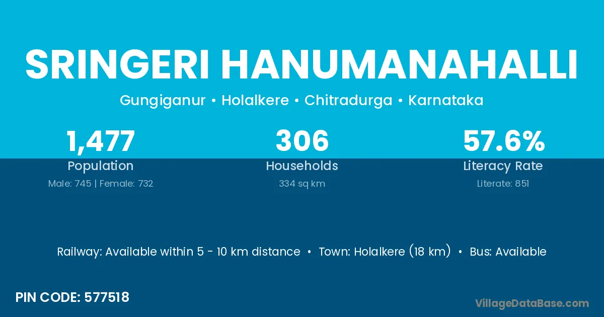 Sringeri Hanumanahalli village has a total population of 1,477 people, of which 745 are males and 732 are females.