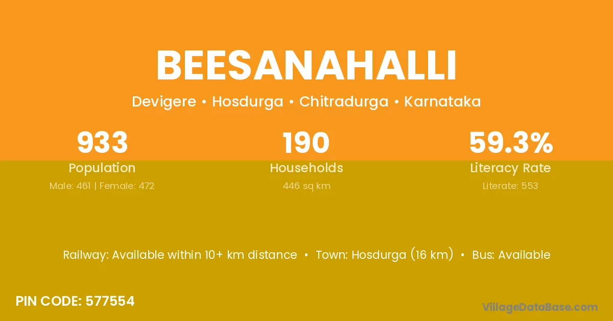 Hosdurga (16 km) is the nearest town to Beesanahalli village for major economic activities and is located approximately 16 km away.