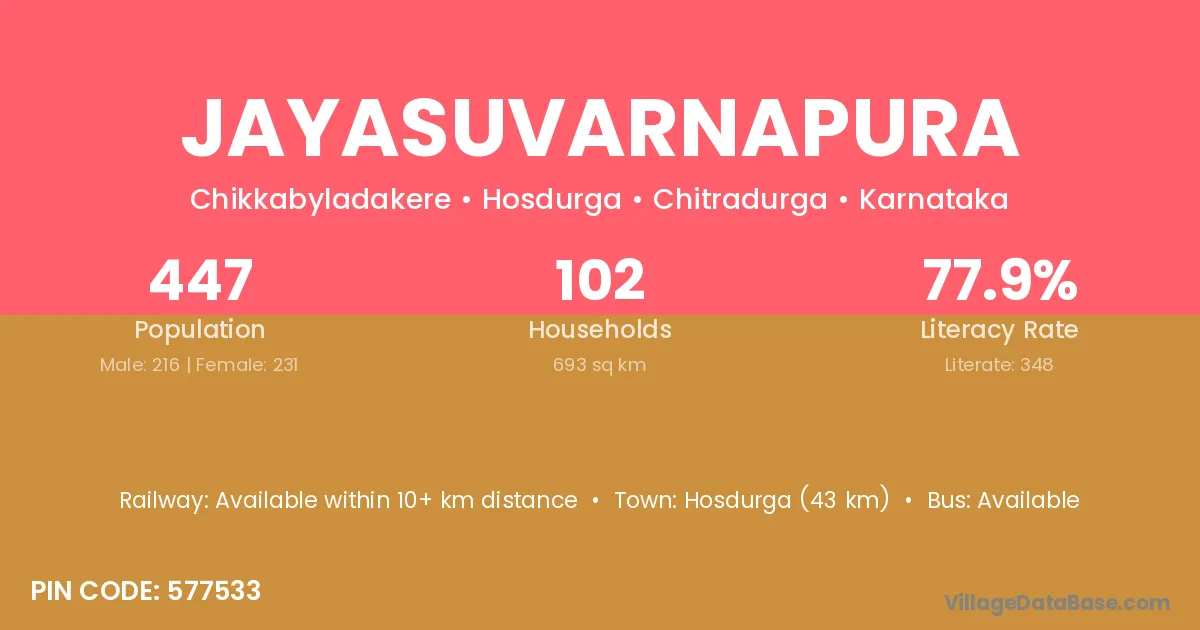 Jayasuvarnapura village has a total population of 447 people, of which 216 are males and 231 are females.