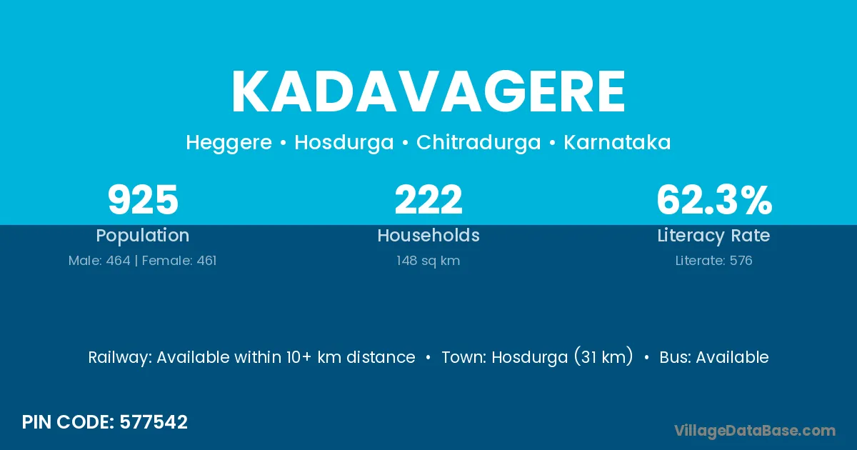Hosdurga (31 km) is the nearest town to Kadavagere village for major economic activities and is located approximately 31 km away.