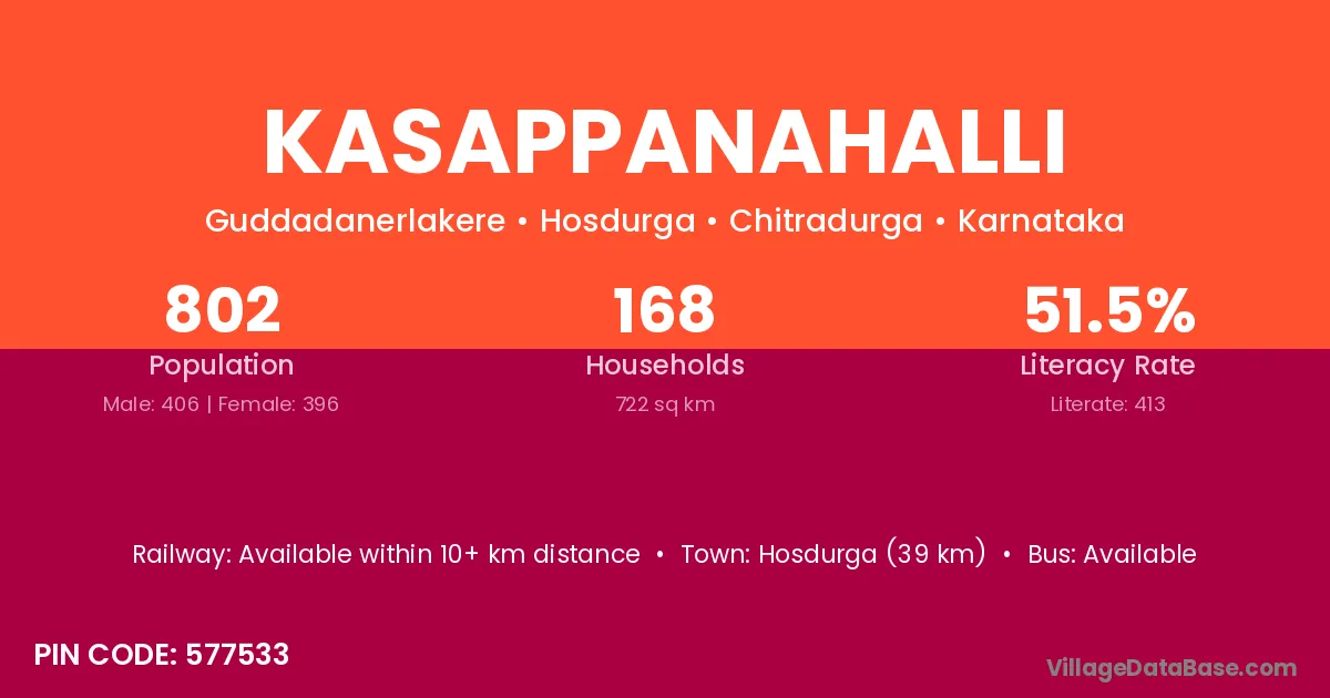 Kasappanahalli village has a total population of 802 people, of which 406 are males and 396 are females.
