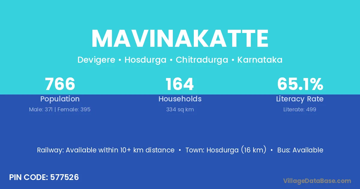 Mavinakatte village has a total population of 766 people, of which 371 are males and 395 are females.