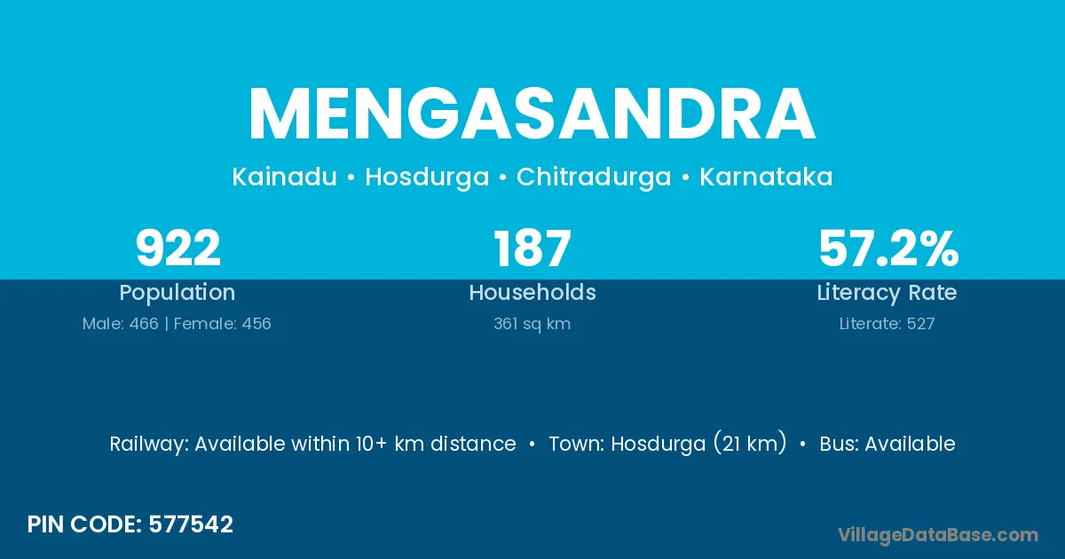 Hosdurga (21 km) is the nearest town to Mengasandra village for major economic activities and is located approximately 21 km away.