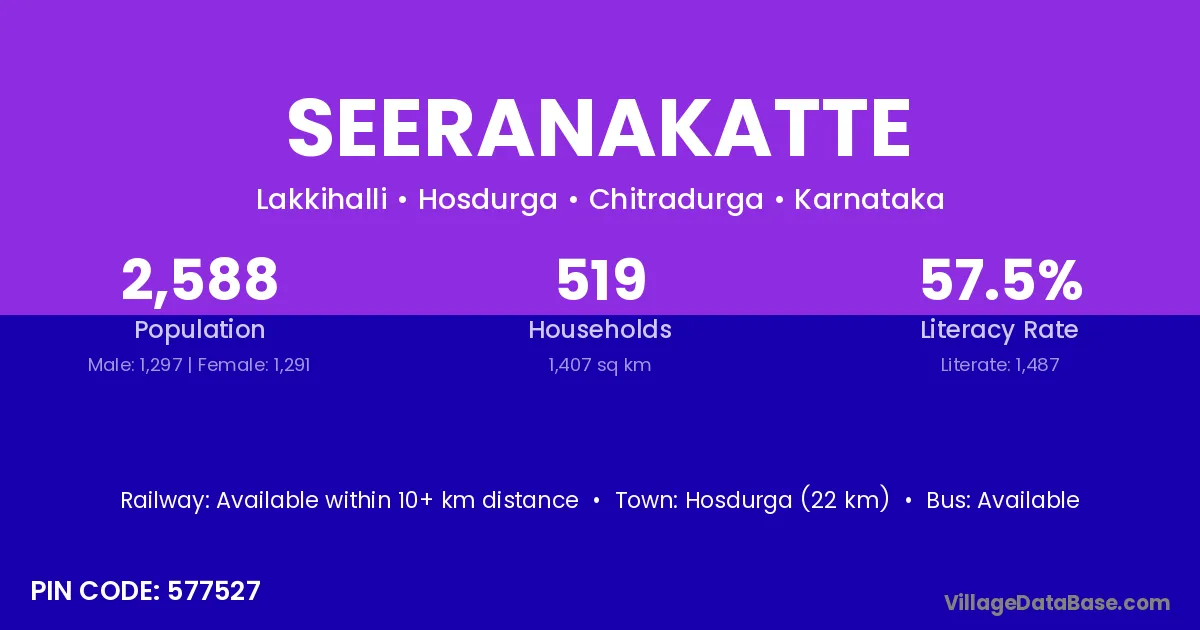 Seeranakatte village has a total population of 2,588 people, of which 1,297 are males and 1,291 are females.