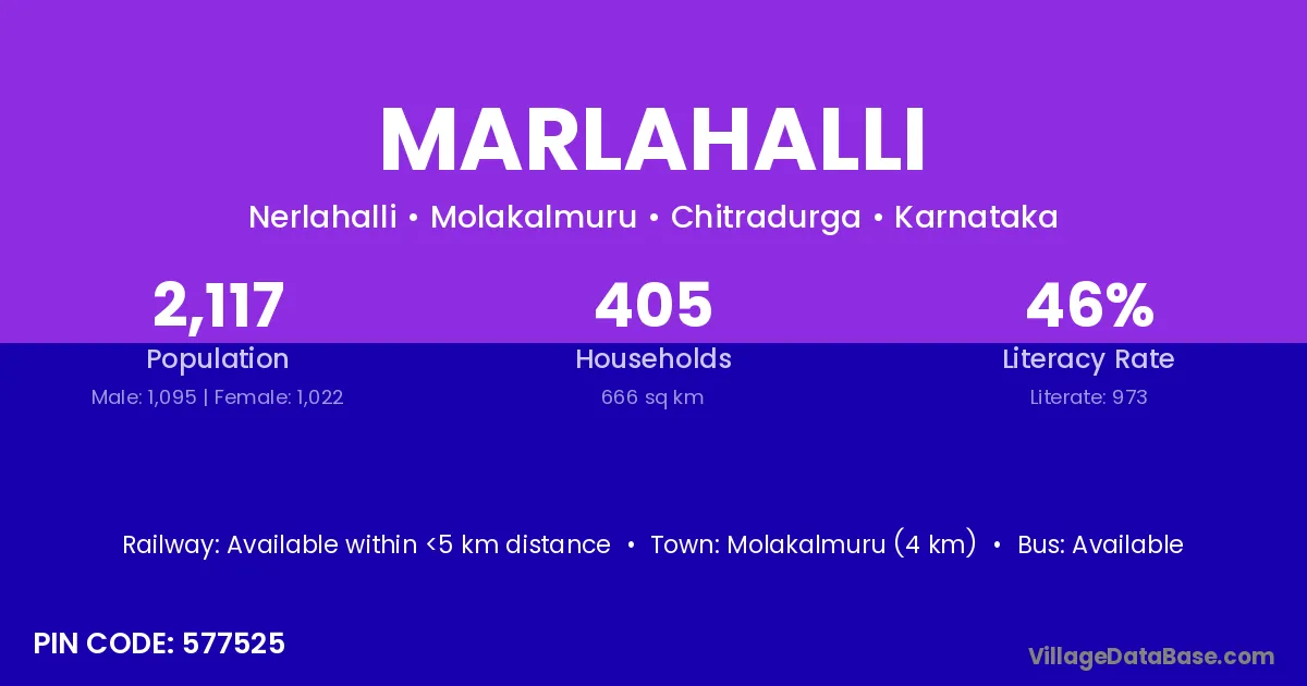 Molakalmuru (4 km) is the nearest town to Marlahalli village for major economic activities and is located approximately 4 km away.
