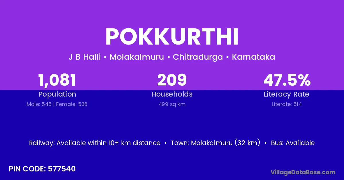 Molakalmuru (32 km) is the nearest town to Pokkurthi village for major economic activities and is located approximately 32 km away.