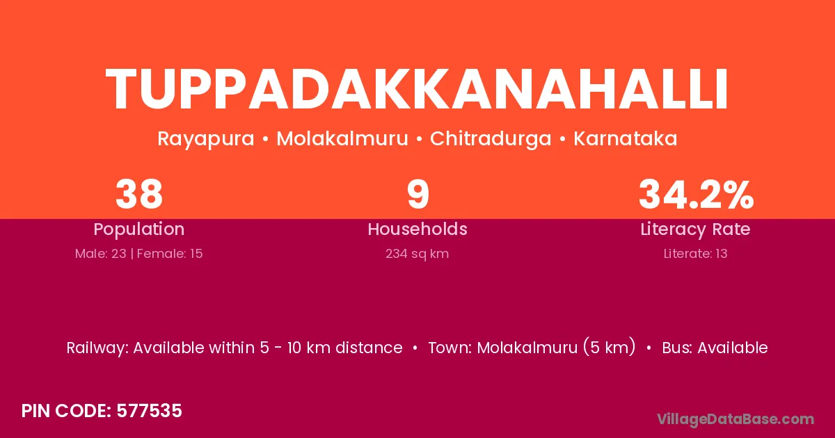 The literacy rate of Tuppadakkanahalli village is 34.21%. Male literacy stands at 43.48% and female literacy at 20.00%.