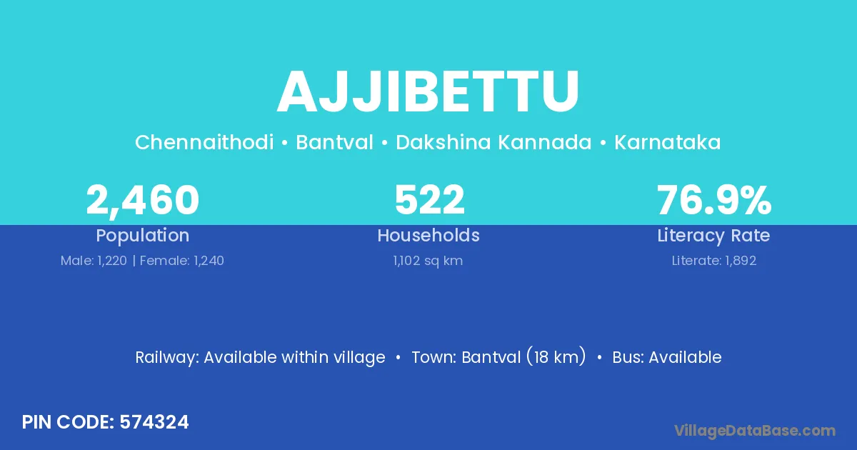 Bantval (18 km) is the nearest town to Ajjibettu village for major economic activities and is located approximately 18 km away.