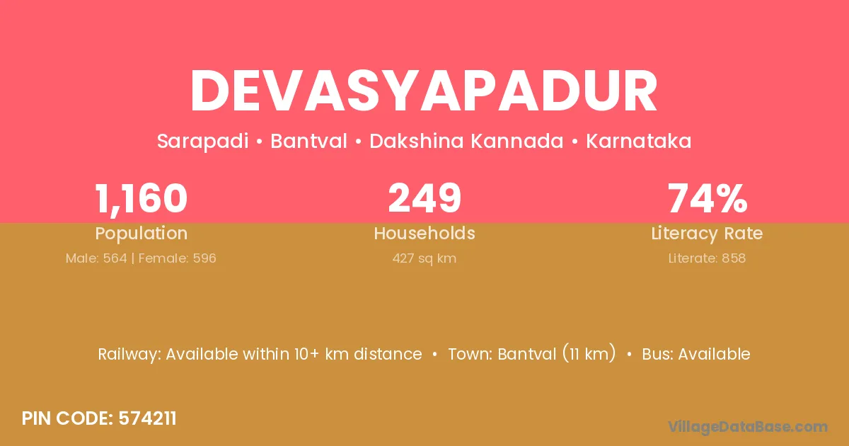 Bantval (11 km) is the nearest town to Devasyapadur village for major economic activities and is located approximately 11 km away.