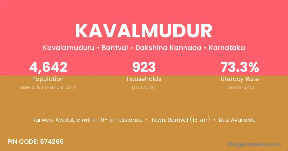 Bantval (15 km) is the nearest town to Kavalmudur village for major economic activities and is located approximately 15 km away.