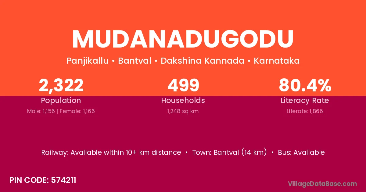 Bantval (14 km) is the nearest town to Mudanadugodu village for major economic activities and is located approximately 14 km away.