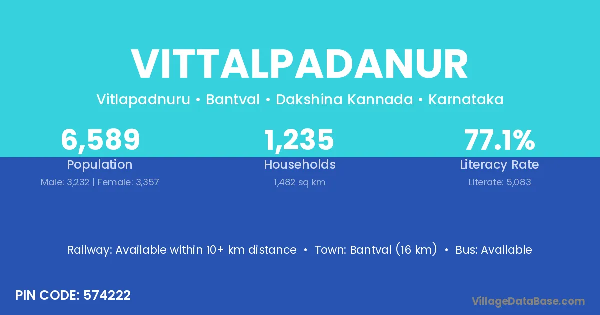 Bantval (16 km) is the nearest town to Vittalpadanur village for major economic activities and is located approximately 16 km away.