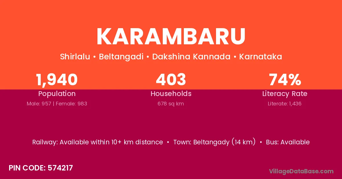 Beltangady (14 km) is the nearest town to Karambaru village for major economic activities and is located approximately 14 km away.