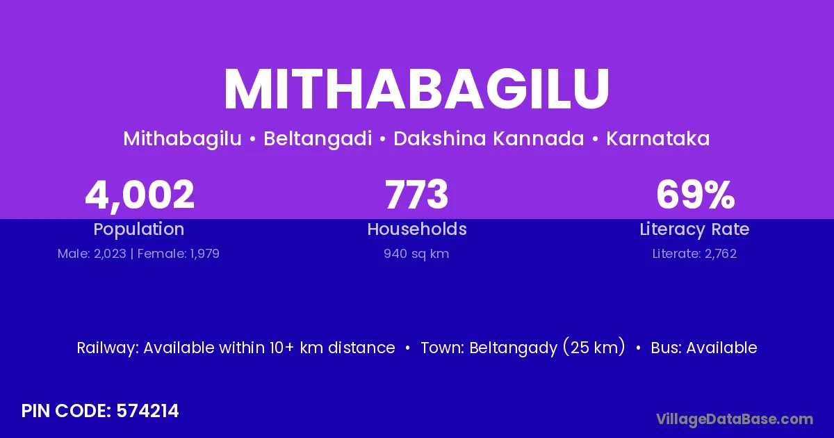 Mithabagilu village has a total population of 4,002 people, of which 2,023 are males and 1,979 are females.
