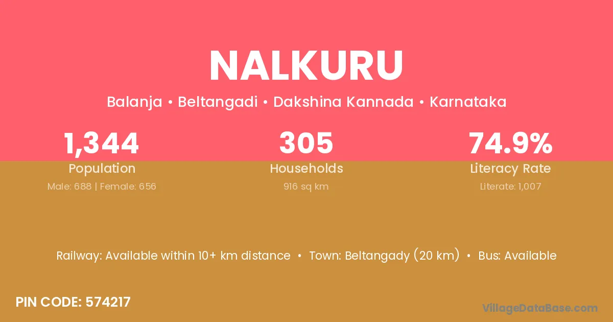 Beltangady (20 km) is the nearest town to Nalkuru village for major economic activities and is located approximately 20 km away.