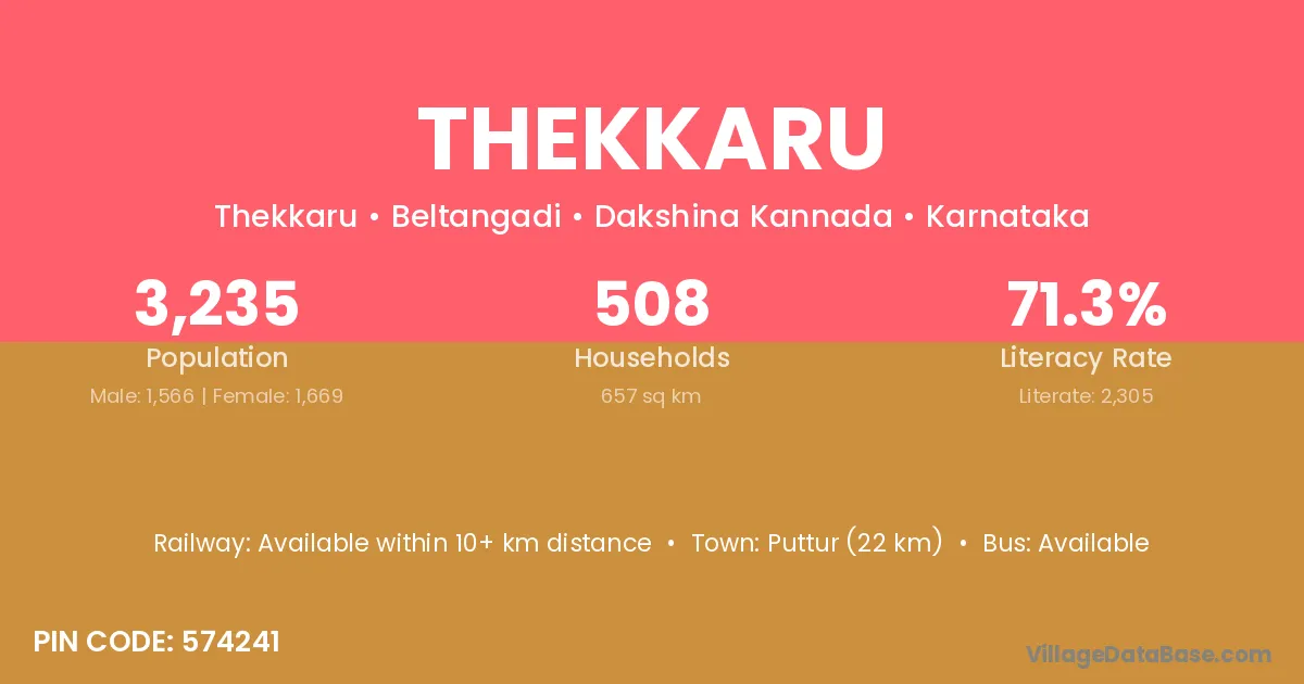 Puttur (22 km) is the nearest town to Thekkaru village for major economic activities and is located approximately 22 km away.