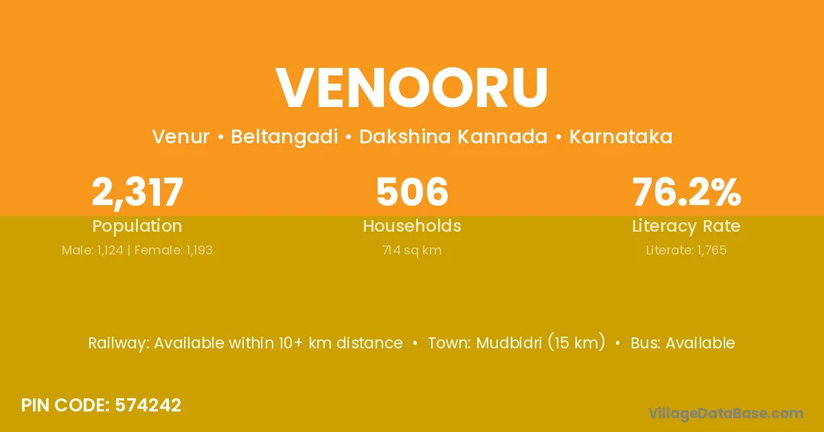 Mudbidri (15 km) is the nearest town to Venooru village for major economic activities and is located approximately 15 km away.