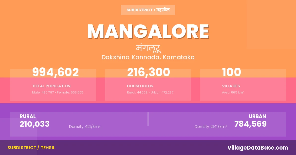 According to the 2011 census The total area of Mangalore Taluka is 865 km², with a population of 994602 people. The population density is 1,150 inhabitants per square kilometre, and there are approximately 216300 houses in the sub district.
