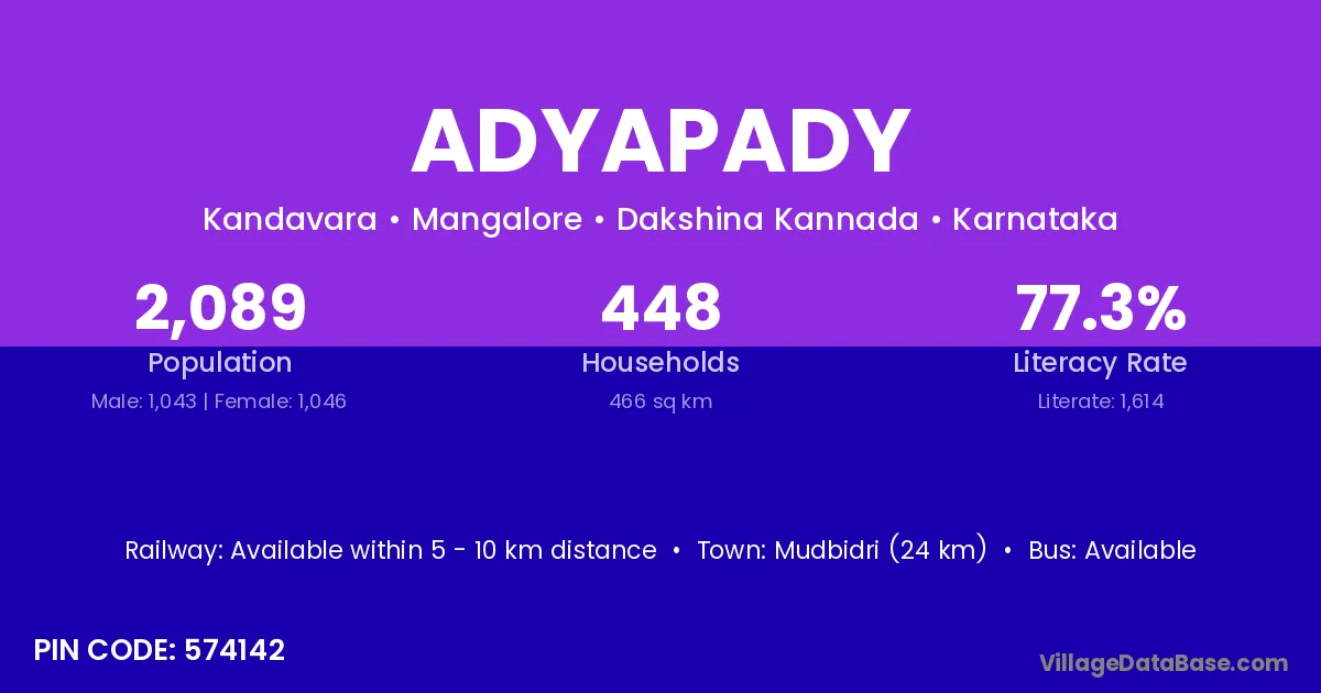 Mudbidri (24 km) is the nearest town to Adyapady village for major economic activities and is located approximately 24 km away.