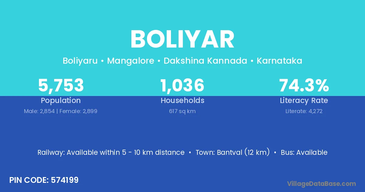 Bantval (12 km) is the nearest town to Boliyar village for major economic activities and is located approximately 12 km away.
