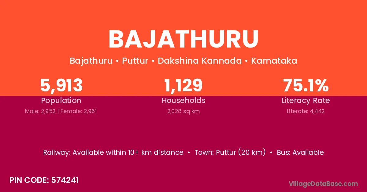 Puttur (20 km) is the nearest town to Bajathuru village for major economic activities and is located approximately 20 km away.