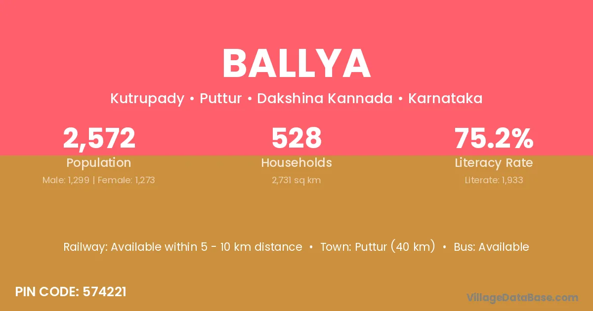 Puttur (40 km) is the nearest town to Ballya village for major economic activities and is located approximately 40 km away.