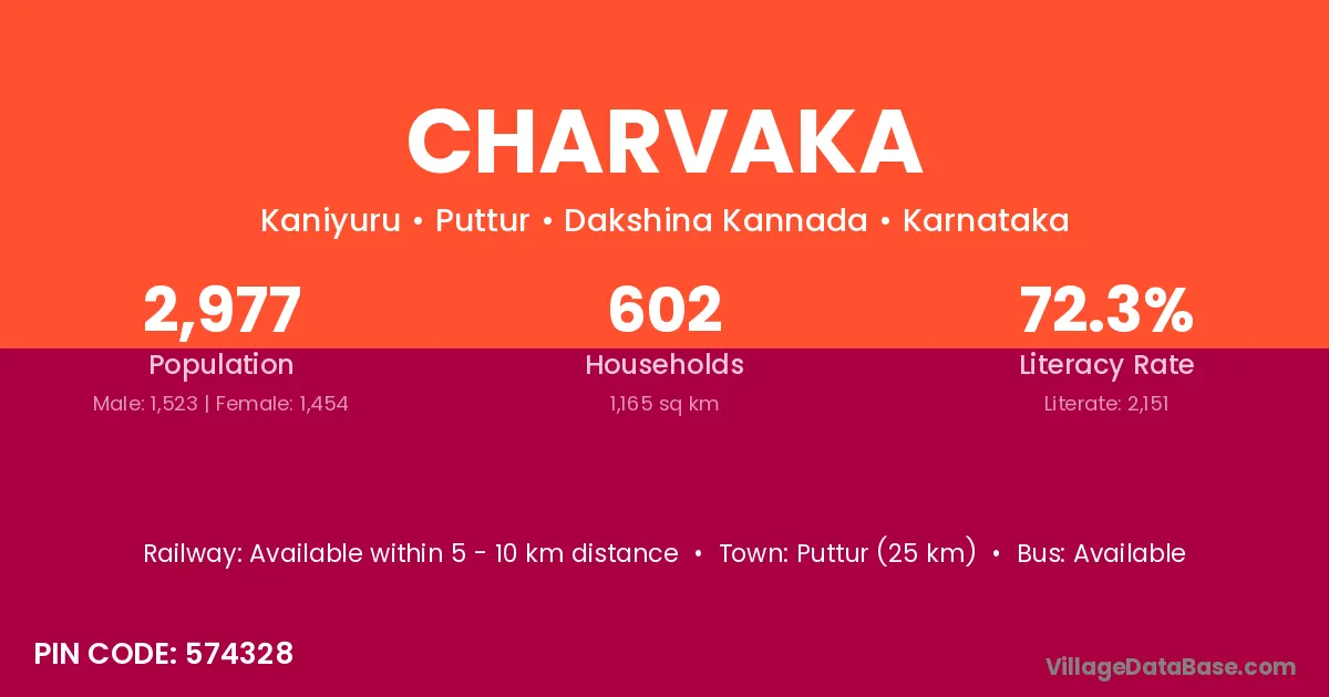 Puttur (25 km) is the nearest town to Charvaka village for major economic activities and is located approximately 25 km away.
