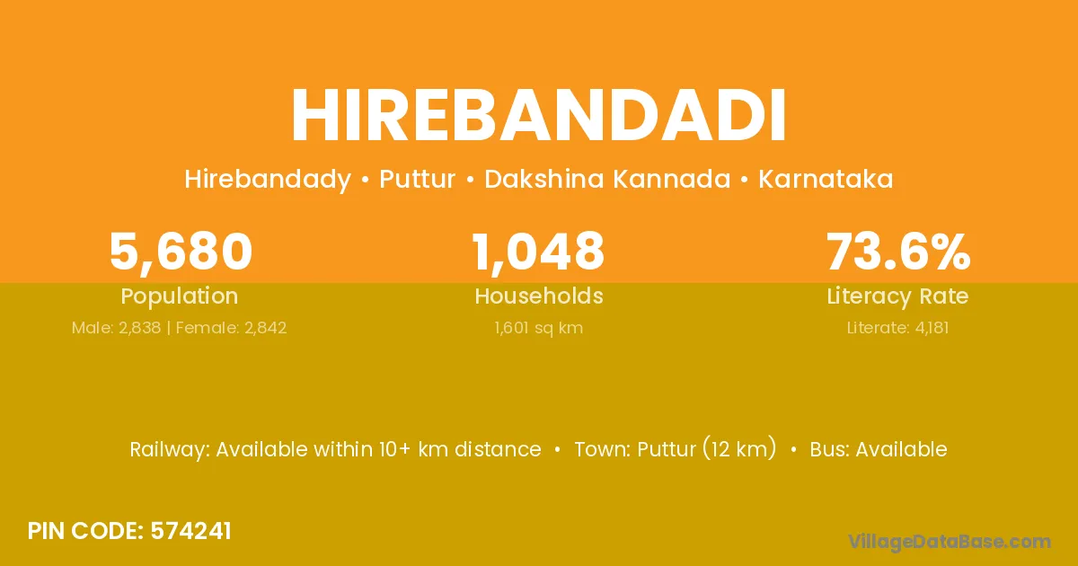 Puttur (12 km) is the nearest town to Hirebandadi village for major economic activities and is located approximately 12 km away.
