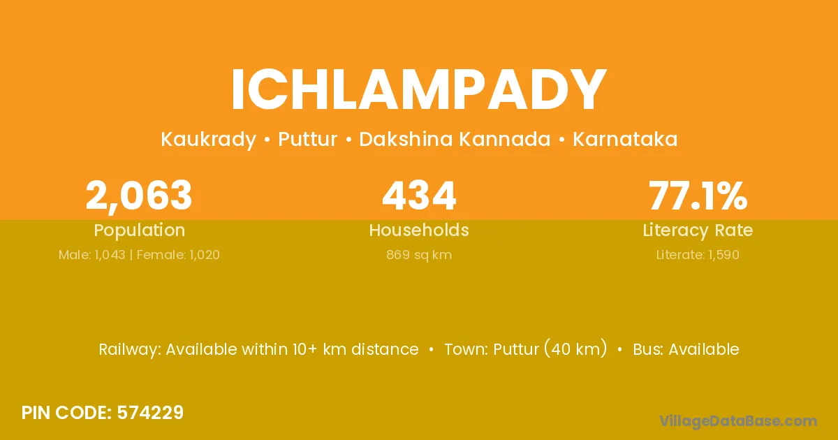 Puttur (40 km) is the nearest town to Ichlampady village for major economic activities and is located approximately 40 km away.