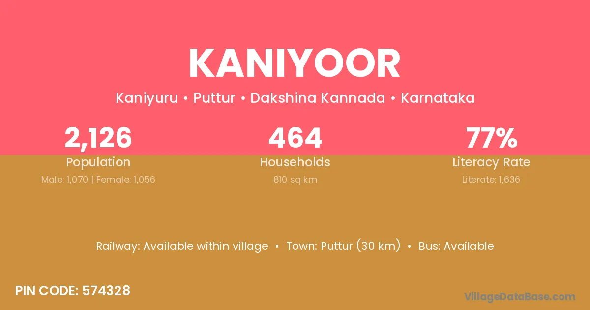 Puttur (30 km) is the nearest town to Kaniyoor village for major economic activities and is located approximately 30 km away.