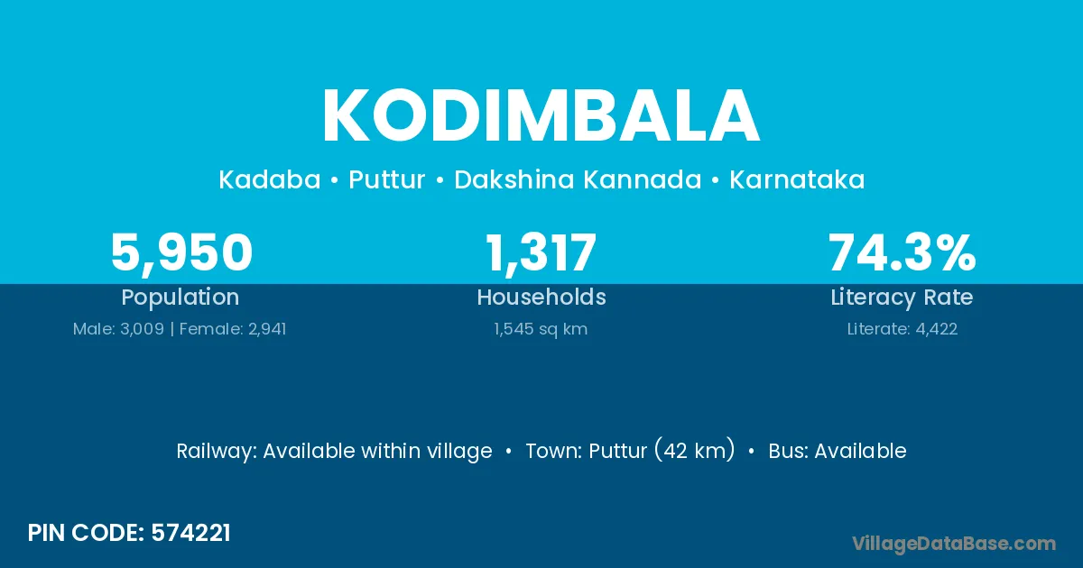 Puttur (42 km) is the nearest town to Kodimbala village for major economic activities and is located approximately 42 km away.