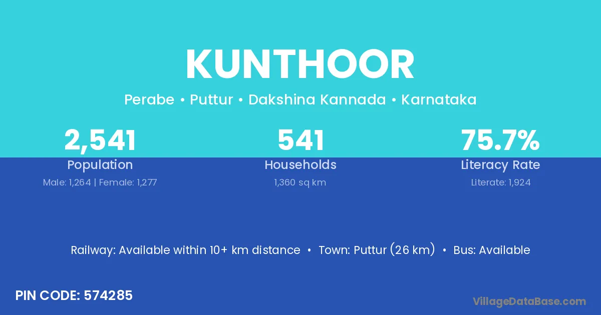 Puttur (26 km) is the nearest town to Kunthoor village for major economic activities and is located approximately 26 km away.