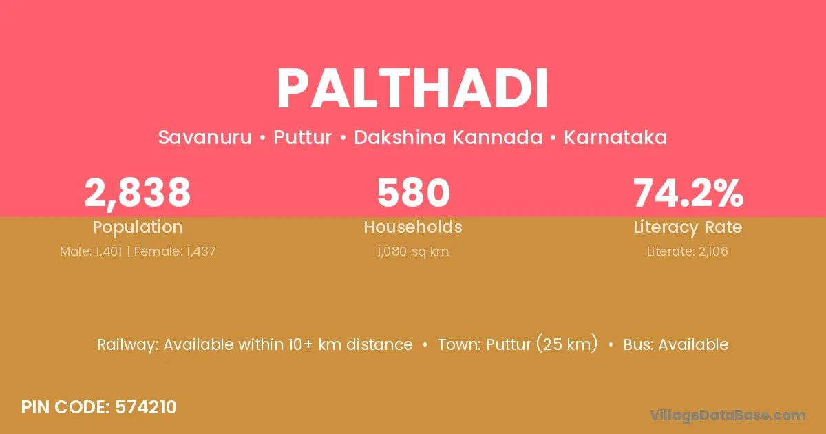 Puttur (25 km) is the nearest town to Palthadi village for major economic activities and is located approximately 25 km away.