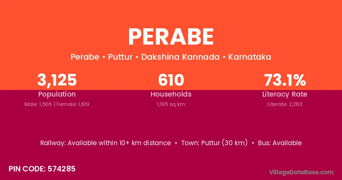 Puttur (30 km) is the nearest town to Perabe village for major economic activities and is located approximately 30 km away.