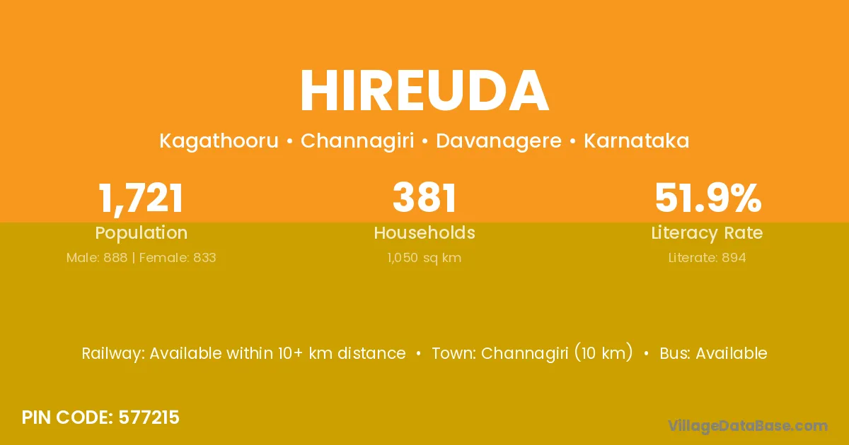 Channagiri (10 km) is the nearest town to Hireuda village for major economic activities and is located approximately 10 km away.