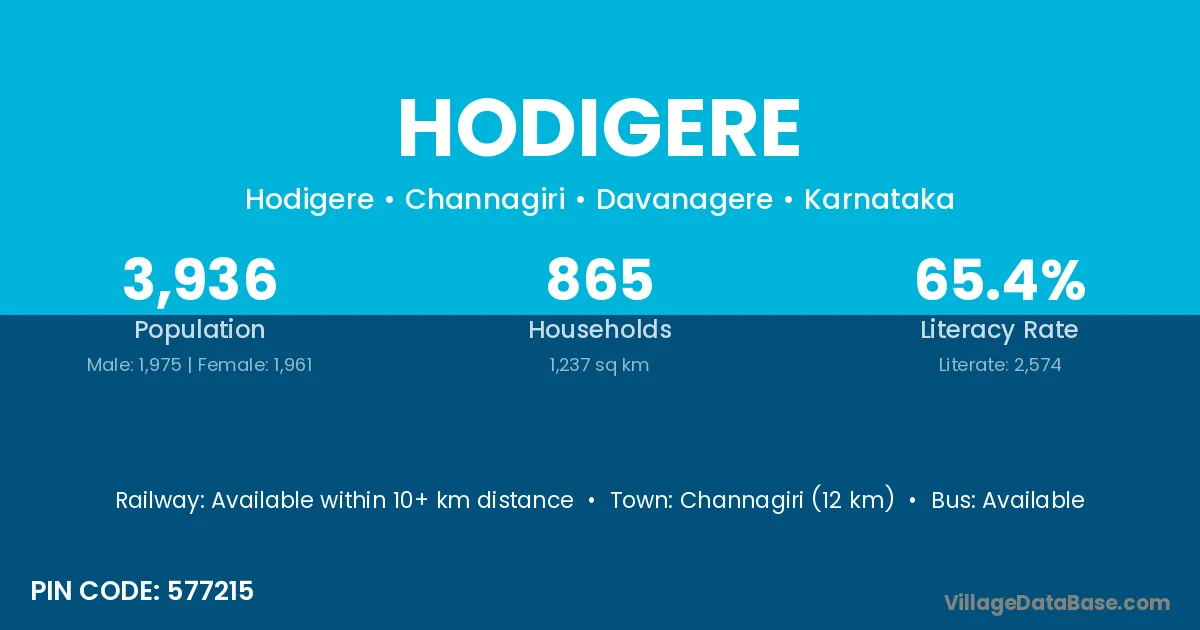 Channagiri (12 km) is the nearest town to Hodigere village for major economic activities and is located approximately 12 km away.