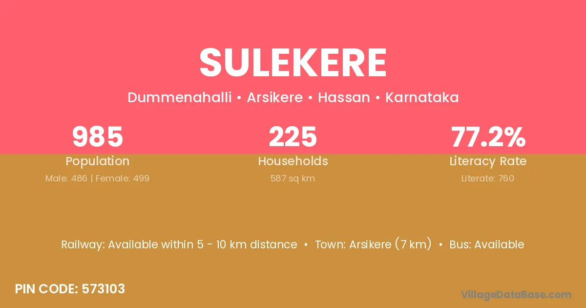 The literacy rate of Sulekere village is 77.51%. Male literacy stands at 85.33% and female literacy at 68.18%.